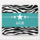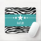 Trendig och modern Sassy Star Zebra Mousepad med en chic svart och vit zebra tryck-bakgrund och en fet turkos gräns med roligt stjärnmotiv. Den här giftiga designen kan anpassas med den personlig du väljer. Klicka på Anpassa om du vill söka efter fler anpassningsalternativ.