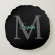 Teal skriptnamn, stor grå monogram på svart rund kudde