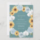 A striking teal backdrop provides the base for this botanical design, featuring a lush arrangement of golden sunflowers, pale blue hydrangeas, and elegant white orchids. The vibrant color palette creates a cheerful and sunny atmosphere perfect for a late summer or early autumn event. Delicate watercolor details bring the floral elements to life, offering a sophisticated and artistic aesthetic.