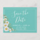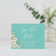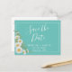 Söt Spara datum meddelande vykort har vattenfärgsvit daisy i hörnet på ljusteal bakgrund med vita anpassaden i modernt typsnitt. Lägg till QR-kod för anpassningsbar och annan information på baksidan.