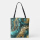 Förhöj din dagliga bärstil med denna fantastiska, personliga totebag med ett lyxigt abstrakt design. Konsten härmar den organiska skönheten hos alkoholbläckets flytande konst, med rika nyanser av djup teal, turkos och akblå, accentuerad med eleganta ådror av falskt guldfolie och glittrande texturer.