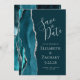 Den vänstra kanten på detta eleganta moderna bröllop spara datum-kort har en tealblå akvarell-agat-kant med silverfalskt glitter. Den anpassningsbara texten kombinerar silvergrå handskrift, kopparplåt och kursiva teckensnitt på en mörk tealblå bakgrund.