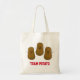 Rolig tote-handväska med tre tecknade bruna potatisar. Varje potatis har en stor glad leende och små svarta ögon. Nedan finns en mall som läser TEAM POTATIS. denna mall kan användas som den är eller ändras till din egen text.