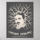 Teckning från Nicola Tesla med elektricitet som avfyrar honom och, "Team Tesla", texttext i gammal skrift.