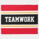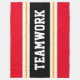 Den här sportiska, atletiska designen har fet TEAMWORK-text inuti ett markerat svart rand med dubbla vit och gult tävla ränder mot ljusröda yttre ränder. Texten i den här designen kan vara personlig.