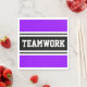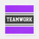 Den här sportiska, atletiska designen har fet TEAMWORK-text inuti ett markerat svart rand med dubbla vit tävla ränder mot ljus bakgrund av lila. Texten i den här designen kan vara personlig.