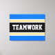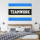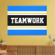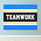 Den här sportiska, atletiska designen har fet TEAMWORK-text inuti ett markerat svart rand med dubbla vit och gult tävla ränder mot ljusblå yttre ränder. Texten i den här designen kan vara personlig.