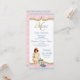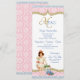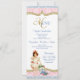 Vintage meny för födelsedags-teaparty med söt viktoriansk flicka på vacker rosa damask och blå bakgrund. Denna vackra rosa, blå och guld-teaparty-meny kan enkelt anpassas för ditt evenemang genom att helt enkelt lägga till dina uppgifter i den typsnittsstil och färg du väljer. Detta är en tryckt design utan verklig glitter.