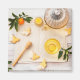 Glas tekanna och tekopp med grönt te, honung, honungsspoon, kumquat och kakor med fjärilform över teatowel-redo.