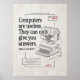1980-talets vintage-stil-grafik kombinerar ett smart teknikcitat med en teckning av en fiktiv persondator och hybridvisning. I texten står det: "Datorer är värdelösa. De kan bara ge svar till ge". En underbar presentidé för gäk, kodrar, tekniska proffs och alla som är intresserade av teknik. Skapat av Piotr Kowalczyk & AI © First publicerad: 12.03.2024.