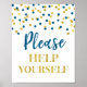 Vänligen hjälp dig själv skylt för baby shower, bröllopsfest, födelsedagsfest eller bröllop i en marinblå och guld konfetti mönster.