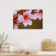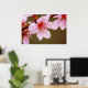 Ett nära digitalt foto, som fortfarande är levande, av en rosa persikoblomma på ett gren som visar petaler, frimärken och blommarnas centrum med andra blommor som omger den.