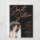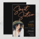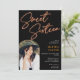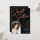 Ett fet, ljusstarkt Neon-orange-signeringsskript med fotobåge sött 16 födelsedagsfest inbjudan på svart.