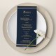 Teckensnittet rustic Bröllop Menu för guld, blå sk Program