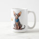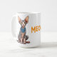 Tecknad illustration av en sitta i Sphynx-katten upprätt, med blå bandana runt nacke. Katten har stor, uttrycksfull ögon och framstående öron, med en mjuk och hårlös jacka som visar dess unika utseende.