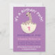 Den söta chicken i baby har just kläckts och väntar bara på party! Ritad i roligt tecknad stil på en ljus lila-polka-punktbakgrund.