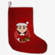 Utformning med en illustration av en söt leende lycklig-flicka med svart kort-hår, hon bär röd och vit Jultomten-dräkt och håller en present; juldesign med röd bakgrund och helgdagar med röd bakgrund