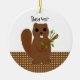 En söt tecknad bäver med stora tänder och ett gren med löv i hans tass.