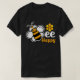 Den här svarta t-shirt-skjortan har ett sött tecknad med stort ögon och ett vänligt leende, som hänger nära ett kluster av gult- och orange-honungskammar. Orden "Bee Lycklig" är skrivet i ett lekfullt typsnitt som förstärker ett glatt och optimistiskt tema. Det är en härlig design som tar en liten bit av stollig.