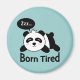Söt tecknad panda som sover på mage med den roliga texten "Född trött". Panda ser trött ut på grund av de mörka fläckarna runt ögonen som ser ut som mörka ringar under ögonen av sömnbrist. För alla som gillar söta djur eller roliga tecknade bilder.