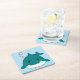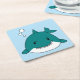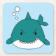 Söt tecknad blå och vit haj med svarta ovaler för ögon och stora vassa spetsiga tänder. Han blåser vita bubblor mot en blå bakgrund.