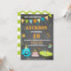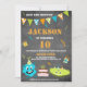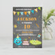 Tecknad funky blå och grön monster med födelsedags hattar, presenter, födelsedagsbanner och tårta, med svart tavla bakgrund och anpassad text födelse dags inbjudan för pojkars födelsedag