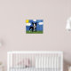 Den här söta tecknaden stil Boston Terrier står i ett grönt grönt, en lycklig-scen. Den enkla poster är ljus och glad med hund på gräs i grönt, vita moln, blå texturerad bakgrund himlar, gult sol och fågellsiluetter som flyger över huvudet.