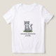 En t-shirt med en tecknad som illustrerar en katt sitta på gräs. Den kommer att vara lämplig för husdjurstjänster som katt sitta, groomer, djurbeteende, husbordning osv. Du kan också använda den som gåva till en kattälskare!
