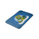Utformning med en illustration av huvudet på en söt liten grönt som dras med ett gyllene ägg och som är utformad i blå cirkel på blå bakgrund. Söt fantasi/för barn med sagor. med anpassadets textmall för ditt namn eller meddelande