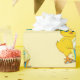 Tecknad av matkyckling med blå öga, födelsedagshatt, att hålla en födelsedagskalas med ett ljus och grattis på födelsedagen-tecken ovan.
