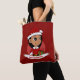 Trädväska med en illustration av en söt leende lycklig-flicka med långt svart hår, hon bär röd och vit Jultomten-dräkt och håller en present. Med redigerbar textmall för ditt namn eller meddelande, juldesign med röd bakgrund, helgdagar med röd bakgrund