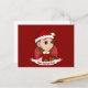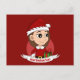 Vykort med en illustration av en söt, leende lycklig-flicka med långt brunt hår, hon bär röd och vit Jultomten-dräkt och håller en present. Med redigerbar textmall för ditt namn eller meddelande utformar helgdagar för jul med röd bakgrund