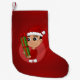 Utformning med ett exempel på en söt leende lycklig småbarn-pojke, han bär röd och vit Jultomten-dräkt och håller en present; juldesign med röd bakgrund och helgdagar med röd bakgrund