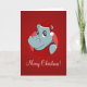 Personligens julkort med en illustration av ett sött lycklig-hippopotamus med röd och vit Jultomten-hatt; julens helgdagar utformar för barn, med anpassade textmall för ditt namn eller meddelande, på röd bakgrund