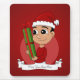 Utformning med ett exempel på en söt leende lycklig småbarn-pojke, han bär röd och vit Jultomten-dräkt och håller en present. Med redigerbar textmall för ditt namn eller meddelande, juldesign med röd bakgrund, helgdagar med röd bakgrund