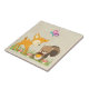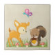 En keramisk bricka med en söt illustration med en baby hjort och en liten ekorre med en akorn och en fjäril som flyger över deras huvuden. De här vackra skogslandarna som står på lite gräs med lite viskaktig svamp vid fötterna. Sandy brun bakgrund