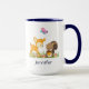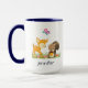 Ett mugg med en söt illustration med en baby-hjort och en liten ekorre med en akorn och en fjäril som flyger ovanför deras huvuden. De här vackra skogslandarna som står på lite gräs med lite viskaktig svamp vid fötterna.