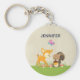 En nyckelkedja med en söt illustration med en baby hjort och en liten ekorre som håller en akorn och en fjäril som flyger över deras huvuden. De här vackra skogslandarna som står på lite gräs med lite viskaktig svamp vid fötterna. Mjuk brun bakgrund.
