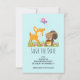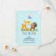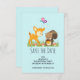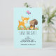 Spara datumkortet med en söt illustration med en baby hjort och en liten ekorre med en akorn och en fjäril som flyger över deras huvuden. De här vackra skogslandarna som står på lite gräs med lite viskaktig svamp vid fötterna. Ljusblå bakgrund.