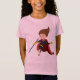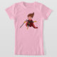 Flickor T-Shirt med en illustration av en söt leende toppen hjälteflicka med röd och svart dräkt och liggande