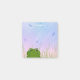 En söt groda med stort ögon håller på att kika igenom ett klokigt gräs i fält på anteckningsblocket i roligt. Söt drakar av varierad storlek flyger över grodden mot blå/rosa himmel - personifiera med namn - med katz_d_zynes