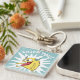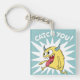 Spelande tecknad gult monster med små horn, vidöppen mun och ett stort tunga som går framåt med den roliga texten "Catch You" på ljusblå bakgrund. Perfekt barnkläder, för barn av dagis, leksaksmur, klistermärken och roligt som sprider humor och glädje.