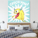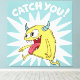 Spelande tecknad gult monster med små horn, vidöppen mun och ett stort tunga som går framåt med den roliga texten "Catch You" på ljusblå bakgrund. Perfekt barnkläder, för barn av dagis, leksaksmur, klistermärken och roligt som sprider humor och glädje.
