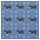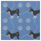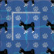 En söt tecknad stil svart och vit chihuahua hund mot blå bakgrund med tass avtryck och spår i grått, rosa och blått