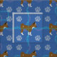 Cute tecknad stil Chihuahua står mot en blå bakgrund med tass avtryck och spår i grått, rosa och blått.
