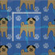 Den här roligten står den söta tecknaden stil Pug med ett leende mot en blå bakgrund med tass avtryck och spår i grått, rosa och blått. Utformning av Diane Blackman. Samma design finns med annan roligt hund bilder.
