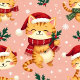 Sömlöst mönster av tecknad katt med röda mössor och halsdukar, sovande och hoppar, med mistel och snöflingor på en rosa bakgrund