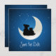 Meddela din förlovning/bröllop på ett okonventionellt sätt med detta söta Spara datumkortet med tecknad illustration av katt och hund silhouettes sitta tillsammans på måne och tittar på stjärnorna. Anpassa den med din egen information eller anpassa den ytterligare om du behöver ändra layouten eller inbjudan storlekt.