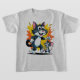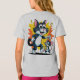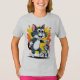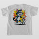 Roligtens tecknad T-shirt-design med en lekfull katt som jagar en mus med ost. Ljusa färger, tecknad, explosionsbakgrund och dynamisk teckning stil gör den till perfekt för avslappnadens bära.