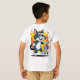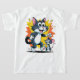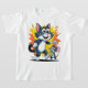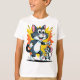 Roligtens tecknad T-shirt-design med en lekfull katt som jagar en mus med ost. Ljusa färger, tecknad, explosionsbakgrund och dynamisk teckning stil gör den till perfekt för avslappnadens bära.